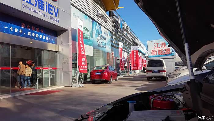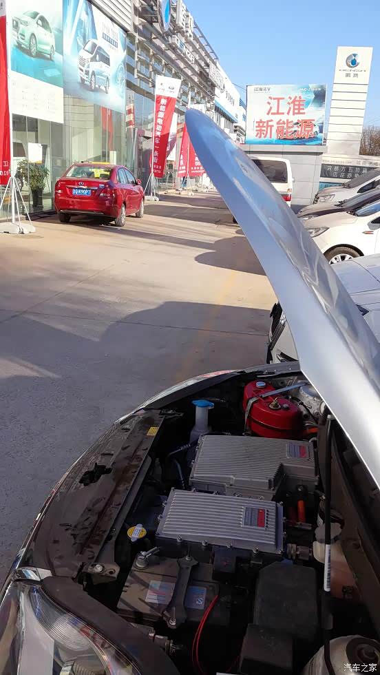 这时候已经是下午的13:20左右了,四个人连午饭都没吃,一直在忙活和看着。韩先生谨慎的征求俺的意见,问能否载他去附近的一个江淮4S店,因为上次他也想带一辆加装了驻车加热器的iEV5去给江淮4S店的销售人员看看,介绍一下埃贝赫的新能源车冬季取暖解决方案,但是那位车主有事没能成行。俺一想这是好事啊,俺在论坛里发帖子,和在4S店展示不是一个道理么,说不定就能帮到某位有着同样想法的新能源车主朋友呢,于是两人开着江5上路了。好像是五方桥那个4S店吧,俺没仔细看,腾势、奇瑞、江淮、北汽的新能源车都在这有店面。从卜师傅那里到五方桥,路上大概开了五六公里,可能驻车加热器调得功率太大,加上那天阳光比较足,车外是11度左右的温度,看了看俺扔在车内的温度计,车内达到了28、29度,俺俩热得必须开窗通风,俺觉得周身发烫,脸上更是热的不行,不得不调到最小功率。