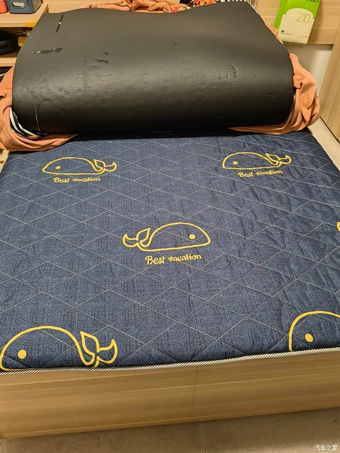 后面的高度平整后,就可以加垫子之类的增加睡眠舒适度了。因为不想额外增购物品,所以就用了平时睡的床垫,如下图,大小竟然也是正好的。枕头就用前排的腰靠抱枕,充分利用。床垫的重量都不重,而且在行车的时候可以叠三次塞进后备箱,不影响后排座椅拉起来。