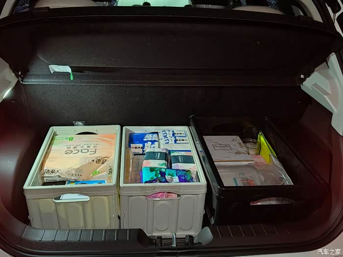 平时露营箱就放在后备箱,放三个刚刚好。里面可以收纳很多小东西:随车充,车载吸尘器,纸巾,应急工具,水之类的,后备箱也变得十分整洁。