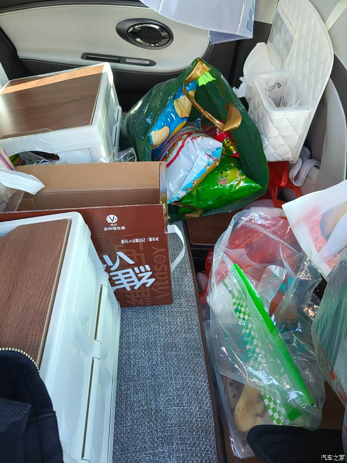 白天起来我们开车的时候,被子就收进后备箱,箱子之类的都放在后座,如下图,从副驾驶伸手拿吃的很方便。