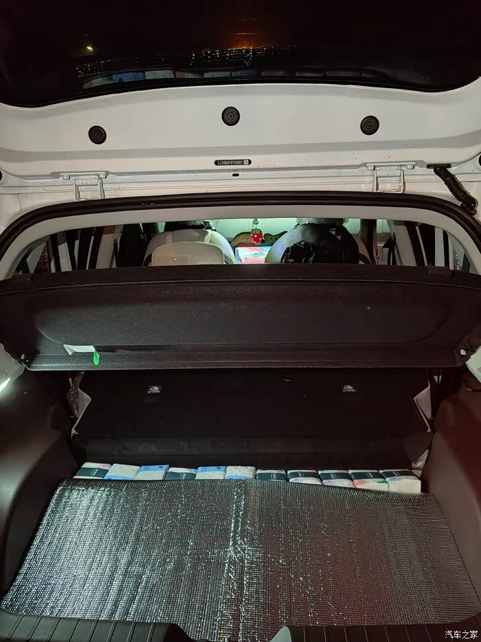 前面两个座位调整完之后,就处理后备箱。后排放倒以后,座位和后面是有大概10-12cm的高度差,需要用东西填平。网上的后备箱收纳盒太贵,而且平时会压缩后备箱的空间,所以我用了纸巾来填平。纸巾的优点:便宜,柔软,本身车上就会放,随用随拿。