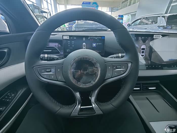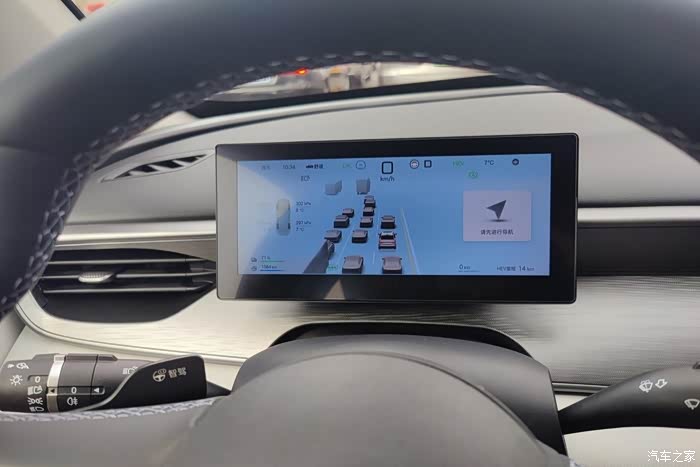 先说方向盘上的智驾拨片,之前试过唐L,人家拨片是金属的,摸着质感好。海豹 06 DM-i 这个是塑料的,手感差一截,有点廉价感。开启智驾挺简单,轻拨一下就行,开启后后视镜会亮小蓝灯,提醒旁边车现在是智驾模式。不过试驾没上高速,高速领航功能没测到。仪表盘上的视觉雷达成像挺清楚的,能显示当前车道和左右车道的车,比如我在最右车道,左边第一第二车道有车都能显示出来,和实际路况差不多。