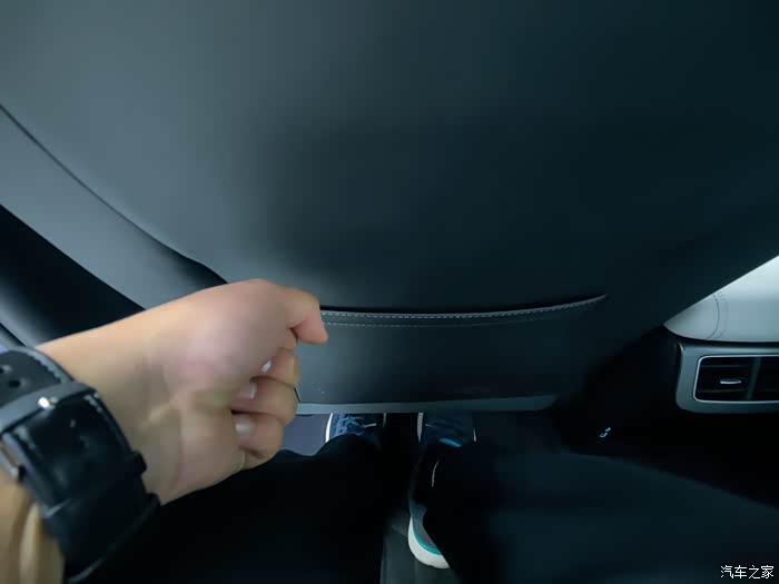 前排:看着前排挺紧凑的,但实际坐进去还行。腿能伸开,调完座椅后,膝盖离前面大概有一拳距离,开久了腿也能稍微伸直,不会太累。不过头顶空间差点意思,离车顶也就2指左右,坐久了有点压抑,高个子可能得适应下。