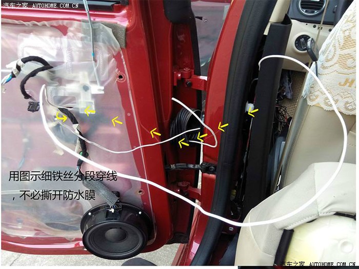 5.7 门灯走线 走线不用打开防水膜 用有点硬度的铁丝顺着 原车线束走就好。车门和车体的连接处有个橡胶环,掀开分段走线,其实用不了多少工夫,走过的线都用绒布胶布包好,防止异响和摩擦。后门直接走到B柱,沿着雷达线走。左前门的和控制单元线一起 右前的和摄像头线一起包好。因为是保险取电没有在车门内取电,全部走双线。