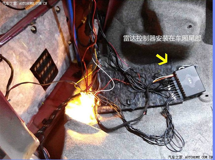 4.5 雷达布线 顺着原厂雷达线,找到雷达控制盒,将其拆除。后加八雷达的控制盒也安装在这里,取电主要是 倒车灯取电 和刹车灯取电 。顺便说下,原厂雷达的做工还是不错,就是功能太单一了。滴滴的也不知道差多远,到底撞上没~一点都不人性化。顺着左后轮上方,走线到后座侧板,延左侧底板顺原车线路,走线到驾驶座前。预留好雷达显示器的长度让其左右摆放都够线长。注意走线沿途会遇到突出螺丝的地方注意多包两层绝缘线,还有就是夹线,在两层毛毡之间。其实单装雷达也可以顶棚走线可能更方便,但考虑到还有其他门灯控制线/刹车灯取电线,就一起走了地板线。