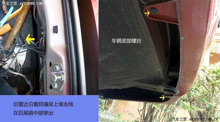4.4 后保险杠拆卸方法 后保险相对还是麻烦些 要拆后保险必须先把尾灯总成卸掉。然后卸掉底板,和轮子护板的螺丝,最角上的两颗螺丝是塑料膨胀螺丝的,不带丝扣的,用力顶下中心就下来了。同样拆卸后雷达还要把后备箱边缘塑料板卸下。这里我犯了个错误,急于把雷达座割下,其实非原厂的雷达孔径比原厂的小,没有底座是装不严的,没办法,又老老实点粘了回去,在热熔胶未凝固前灌满后雷达座,将后装雷达密封好。