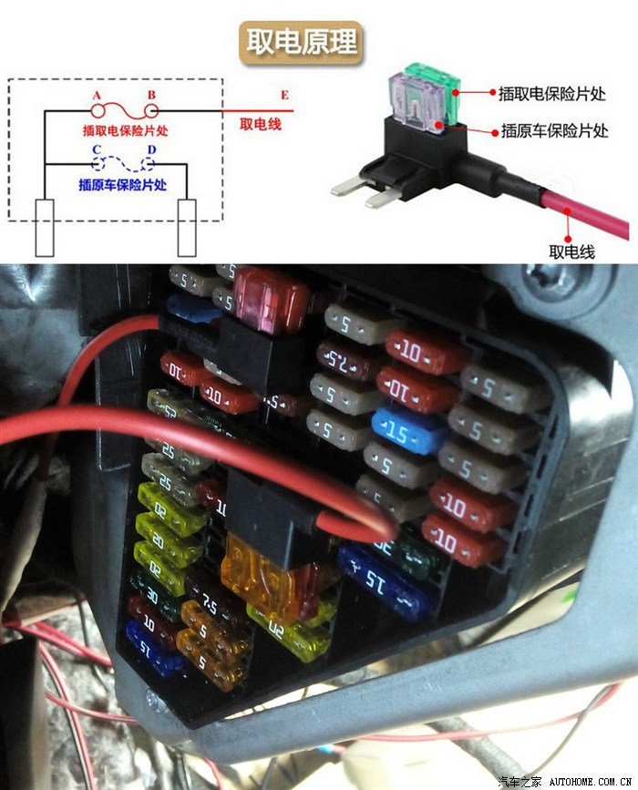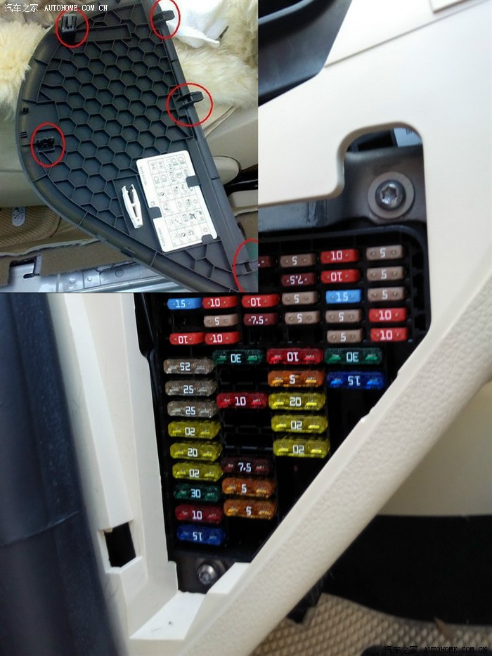 2.2.4 驾驶员左侧的挡板很容易拆下,掀开后就看到保险盒子,盖板里面有拔出保险的小夹子,和保险图片实例。本次主要用到的是 阅读灯保险 (做“永续”电源)和点烟器保险 (ACC电源),淘宝有买保险丝取电转接器的,价格很便宜,也很好用,注意的是 要买一大一小两种型号,直接插上,很牢固也很美观。还多了一份保障。