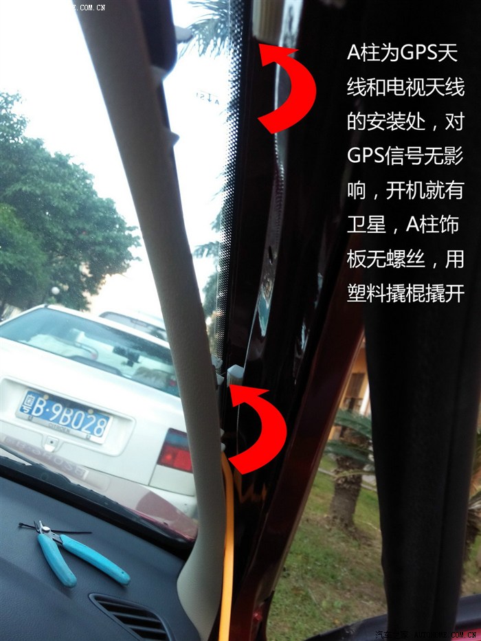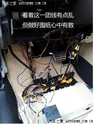 1.2.2 导航线束比较多,看着比较乱,实际安装起来很简单。只用到梯形接头的导航电源。倒车视频输入。AUX视频输入。其他的统统的用不着。从CD的源分电源线出来(有导航专用的分接线束)GPS天线自带磁铁,隐藏在右侧A柱内,对信号几乎无影响。