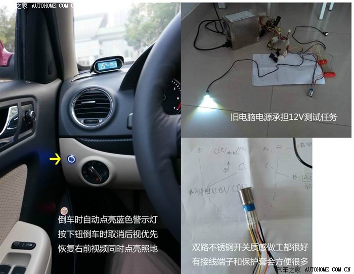 3.2.3这一切都是看上去很美,但是由于倒车优先,所以如果你在倒车时,想看一下右前摄像头的影像,这个百元神器就无法实现了。如何解决解决呢?由于在控制器前端的视频选择也是通过一根灰色的倒车信号线来控制。当倒车信号线出现正电时,视频输出的控制权就会被倒车视频夺走。根据这个原理我们只需要在倒车时,人为的临时切断倒车信号线就可以在倒车时。也可以查看右前方视频了。通过一个双路不带锁开关就可以实现此功能。倒车时按下此开关,倒车信号线被切断,同时按钮蓝色环形指示灯亮起。挡泥板的辅助照明灯同时亮起,为右前摄像头提供夜间照明。此按钮开关安装在 灯光旋钮左侧。基本不影响外观,易于操作。
