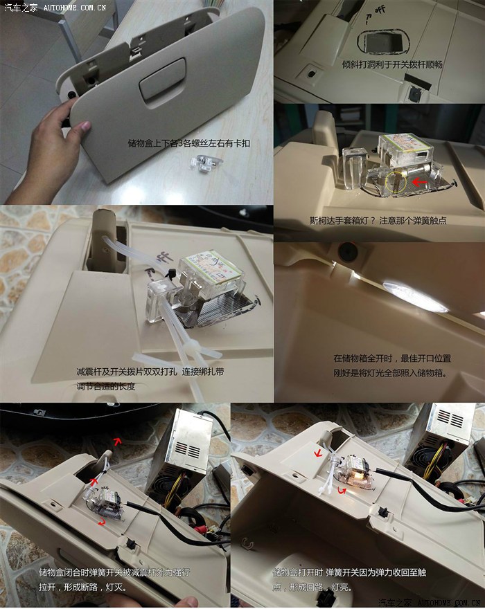 7.2.2 由于不是原厂配的灯,所有细节全要自己设计,比较了各种位置后,确定以下方案。在储物盒上方偏左的位置开灯洞,要倾斜开洞否则开关拉力传递不顺畅。将灯植入,只要开的合适,灯自带的卡扣可以完美扣合。在储物盒背部那两条“支撑杆”上钻个小孔。同样在灯的拨杆上也钻小孔,用绑扎带将两个孔连接起来实现联动。当储物盒打开时,绑扎带松弛,由于弹簧的弹性作用,电路被接通。反之当储物盒闭合是,绑扎带张紧,拉动弹簧,形成断路。