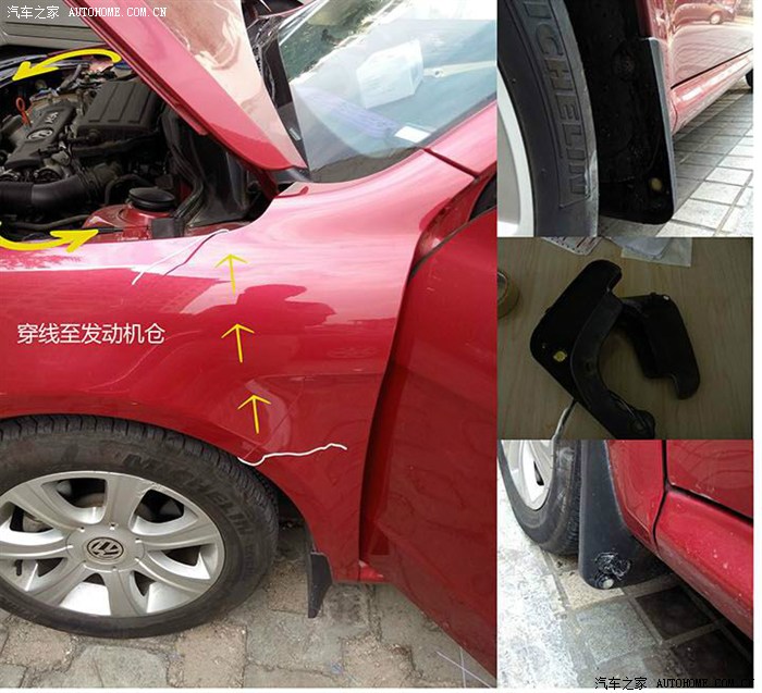 6.2.1用LED灯条是个很好的办法,可是有点太高调,也有网友搞轮眉灯。都是挺不错的方案。吃别人嚼过的馍不香。都玩到这个程度了还不来点个性。原始的设计方案是 将灯装在后视镜上,就是右前摄像头的旁边,考虑到穿线的复杂,拆门的痛苦,还有照射范围,最后放弃。又准备装两个廉价的日行灯在车底前面的灯从前照射后面,后面的灯从后照射前面,趴下身子一看车底,我晕!车底原来不是平的,会阻挡光线。最后打起了前挡泥板的主意,价格低廉,搞坏了也就15块。不喜欢了,随时换掉,不伤车,妥妥的。