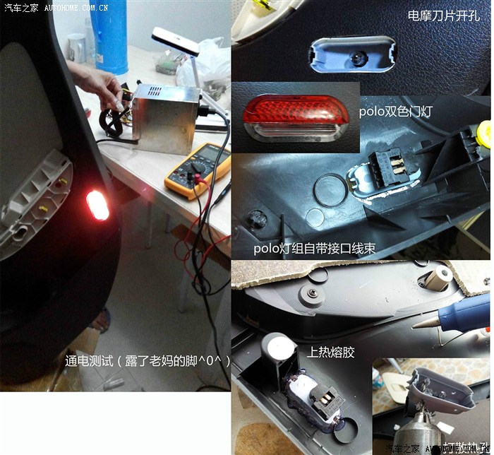 5.4 车灯的安装 电摩和刀片打孔,热熔胶密封,仿效大神“shensi7”打了通气散热孔。没有啥难度,主要注意开孔避让门板后的加强结构就好。