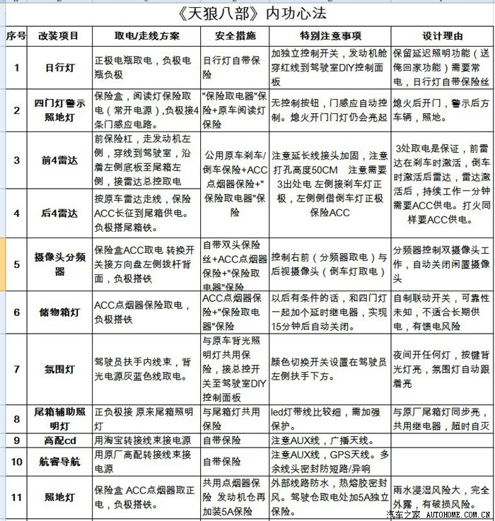 2.1.1 取电与走线也是经过反复推敲,保证每一条线路都可以有至少一处的保险,几乎所有外加的灯光都单独可控制。因为涉及到安全。现整理成表格供以后改车的朋友参考。