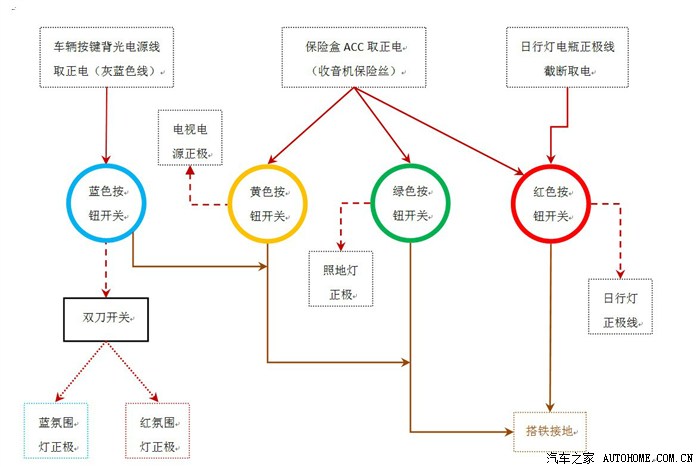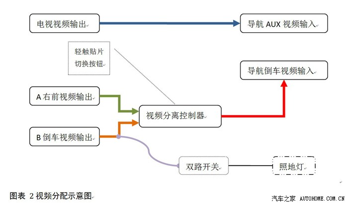 3.2.2 航睿导航只有两个输入端 AUX视频输入端 /倒车影像输入端(这个输入端的优先级最高,只要检测到视频输入,就会自动显示)但是要在 “导航影像” “电视影像”“ 右前影像”“倒车影像” 四种输入自由切换还是有难度的。因此我再次被精明的淘宝卖家忽悠走另外一张毛爷爷,买了所谓的视频分离器。此神器的作用是 A/B两路输入,一路输出,通过一个按键,可以A路B路之间切换。无视频输出时可自动关闭A/B路的电源。于是按照以下做接法实现神器的“一键切换”,贴片式按钮隐藏在左侧灯光拨杆后方,对外观零影响,操作也十分方便。