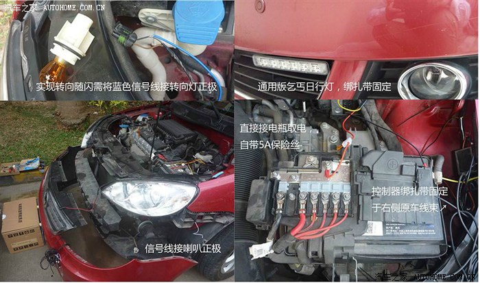 6.1.2 灯头安装,接线。考虑到灯头的宽度和厚度,目前只有安装在这个位置比较和谐,为了和保险杠在一个平面,没使用灯头附赠的托架而是直接在灯头扇热片上打孔,用绑扎带固定。直接电瓶取电,但是要实现 转向随闪的话还是要把信号线接到左右转向灯的正极。右侧喇叭的线在车头左前角。同样要接信号线。