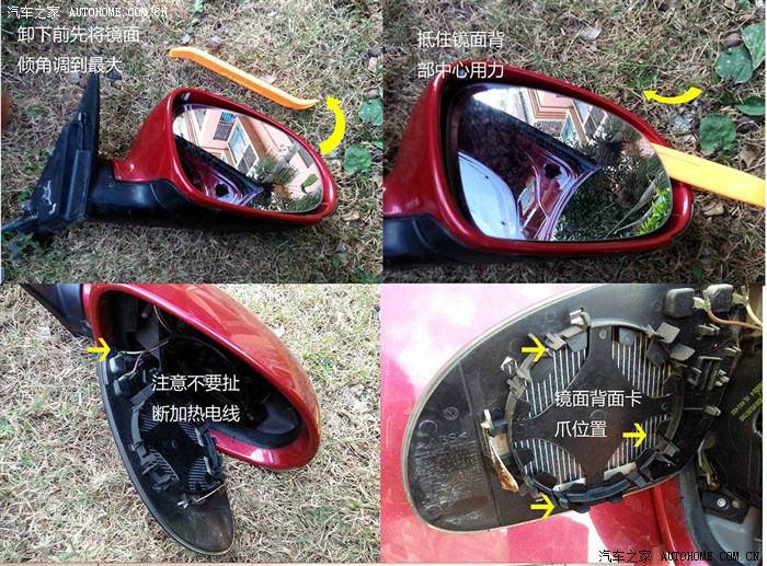 3.1.2 拆下线束,注意保留好圆形的隔水海棉。拧下螺丝,右侧后视镜总成就可以很轻松的取下。(取下线束前,用左侧的后视调节功能把后视镜的左右倾角调到最大,为下步拆镜片做好准备)