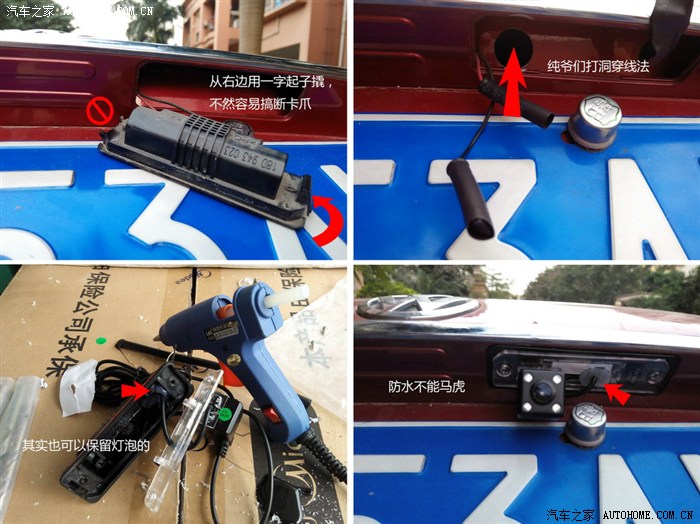 1.2.3 后视摄像头的正确接法应该是,从尾灯电源的地方引摄像头线,但是貌似要拆尾箱的装饰亮条,而且摄像头接口过粗的话,可能还要剪断再接好,太麻烦,我偷个懒,直接上电钻,在右侧牌灯上方打洞。用胶布缝好洞边,避免日后线材被毛刺边缘摩擦破损短路。