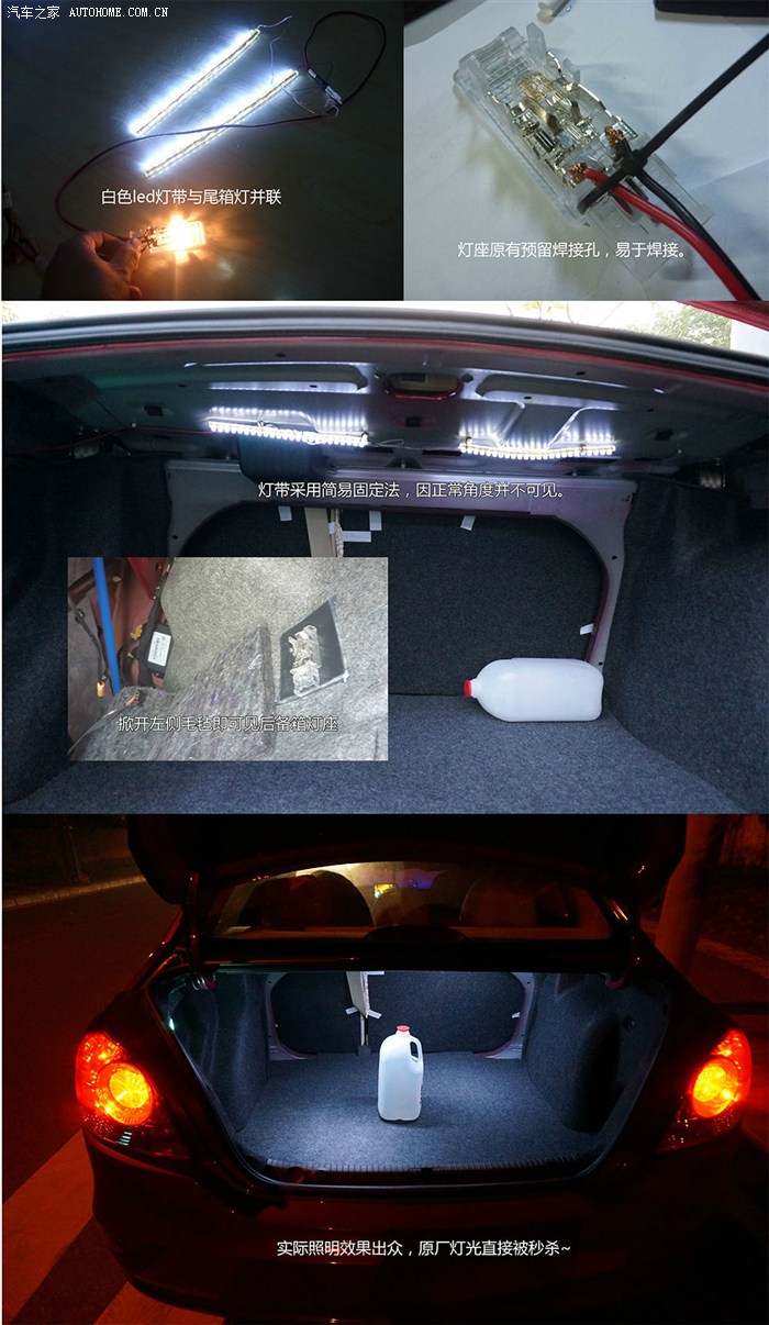 7.2.4 尾箱灯比较简单,掀开尾箱左侧毛毡,直接取下灯座,并联led灯条。在尾箱上方有许多小洞,可以用软线加绑扎线固定灯条,位置稍靠里面些,除非你把脖子伸到尾箱里,不然只见灯光不见灯,丝毫不影响美观。由于是并联电路,几分钟后也会自动熄灭。效果谁用谁知道啊~。