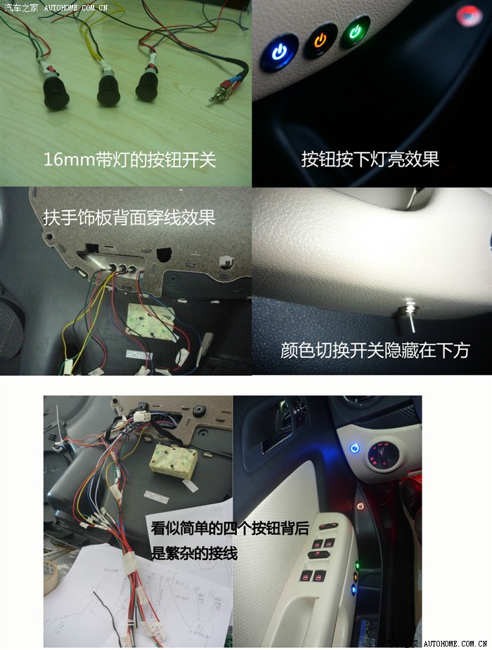 2.2.1 为了达到一切尽在掌握的效果,将外加灯光和设备都加了个单独的电源开关。也避免设备闲置的时候浪费电力。按钮开关安装在驾驶位门把手侧面是为了防止按钮灯光,在夜间刺眼,但是同时也加大了改造难度,这里我犯了本次DIY最大的一个错误,就是蓝色按键的延长位置会挡住车窗升降单元的插头。当时计算的时候,只是计算了车窗升降单元的厚度,忽略了接口公头的厚度,结果导致公头会挡住按钮,因为已经打孔完毕,并且全部用热熔胶密封,所以,只能飞线解决。控制单元线,加带灯的按钮线一共20多条。采购了电脑用的24针公母对接插口,自己做了个对插模块,保证以后拆门方便。