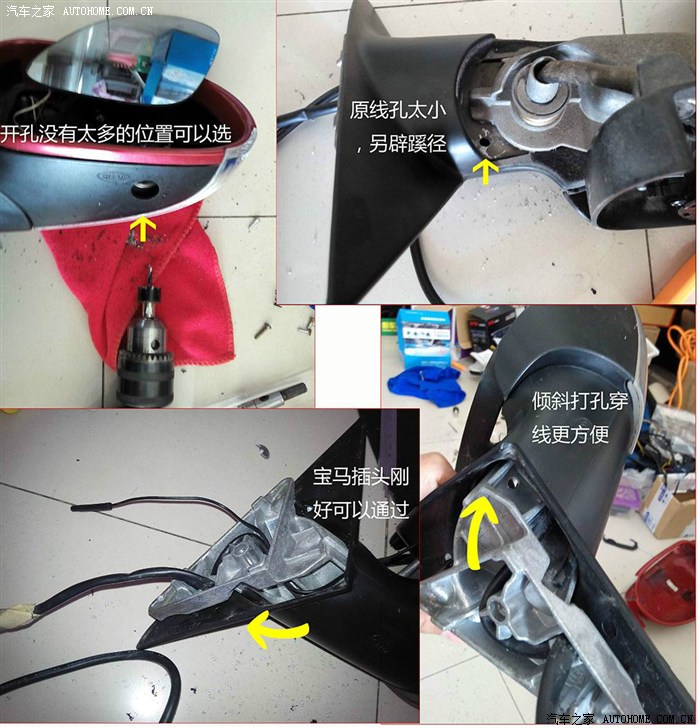 考虑到后视镜弯折的最大角度,在如图位置倾斜打孔,刚好可以穿过宝马头。