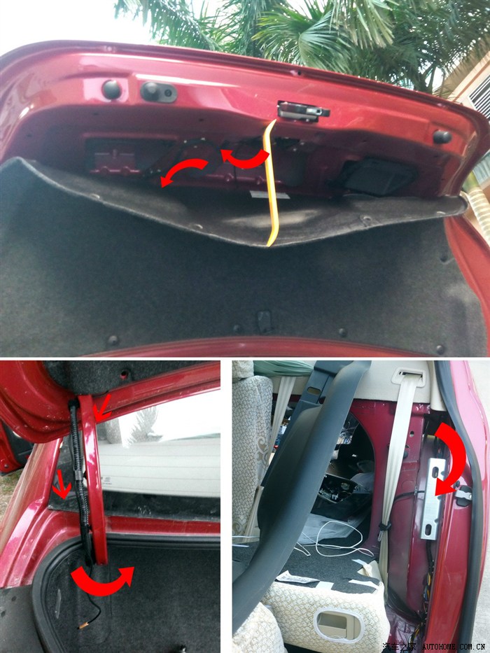 1.2.5摄像头走线,主要是顺着尾箱上盖走线,毛毡不用全拆,拆一部分就好,线顺着上盖金属支架的左侧塑料管,走进尾箱,长度刚刚好。(一般人走线会到右侧,主要是考虑倒车灯取电,其实原车的倒车灯线也是从左侧过去的。左侧走线能顺着原车线路,起到隐形布线的效果。)