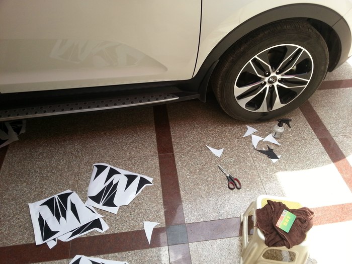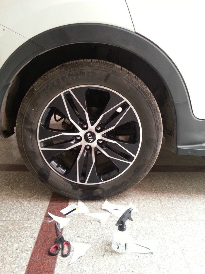 这叫一个漂亮.........本人非常喜欢.........另外说一下.....我一开始喷壶里用的是水....感觉效果不好...速度还慢......没办法只好求救.....给同学打了个电话(他是汽车装潢店的)问他有什么办法提高效率.....他给的办法是...水里少添加点洗碟精.......他说贴膜都是这么搞的......试后效果不错...大大加快了效率........但也用了差不多2个多小时.......应为我买的这个轮毂贴不是很合适.....有点地方自己用剪刀剪的......所以速度有点慢...............