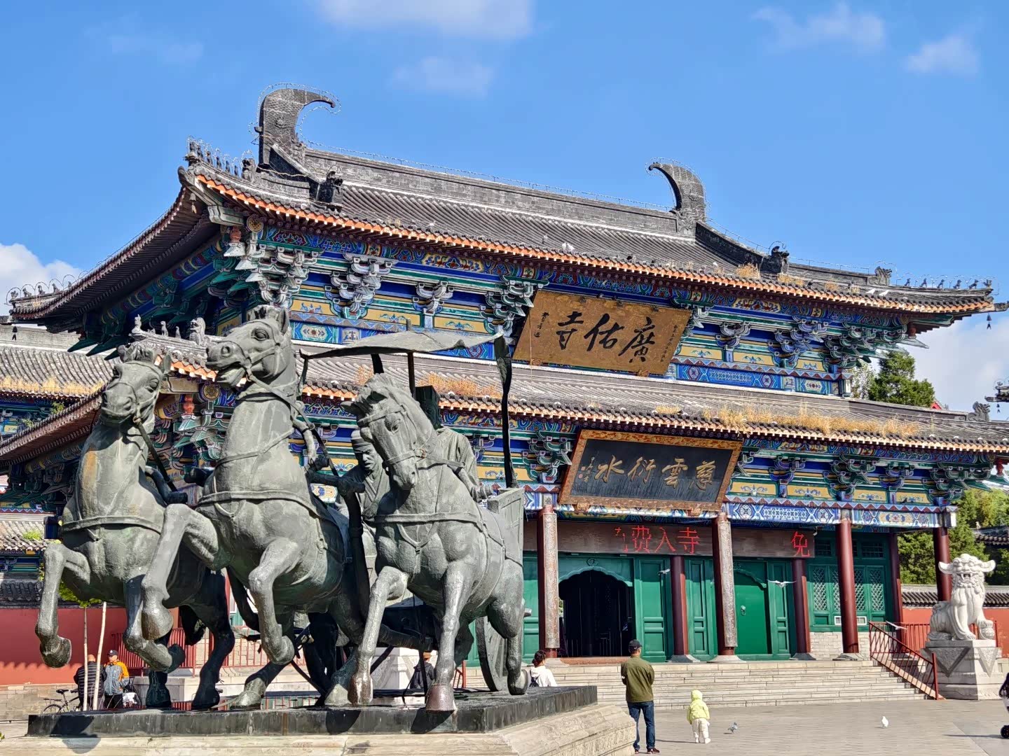 广佑寺占地6万平方米。主轴线上依次有山门殿、天王殿、大雄宝殿和僧舍等。沿袭明清皇家寺院规制,走在这里每一步都踏着历史的回响。
