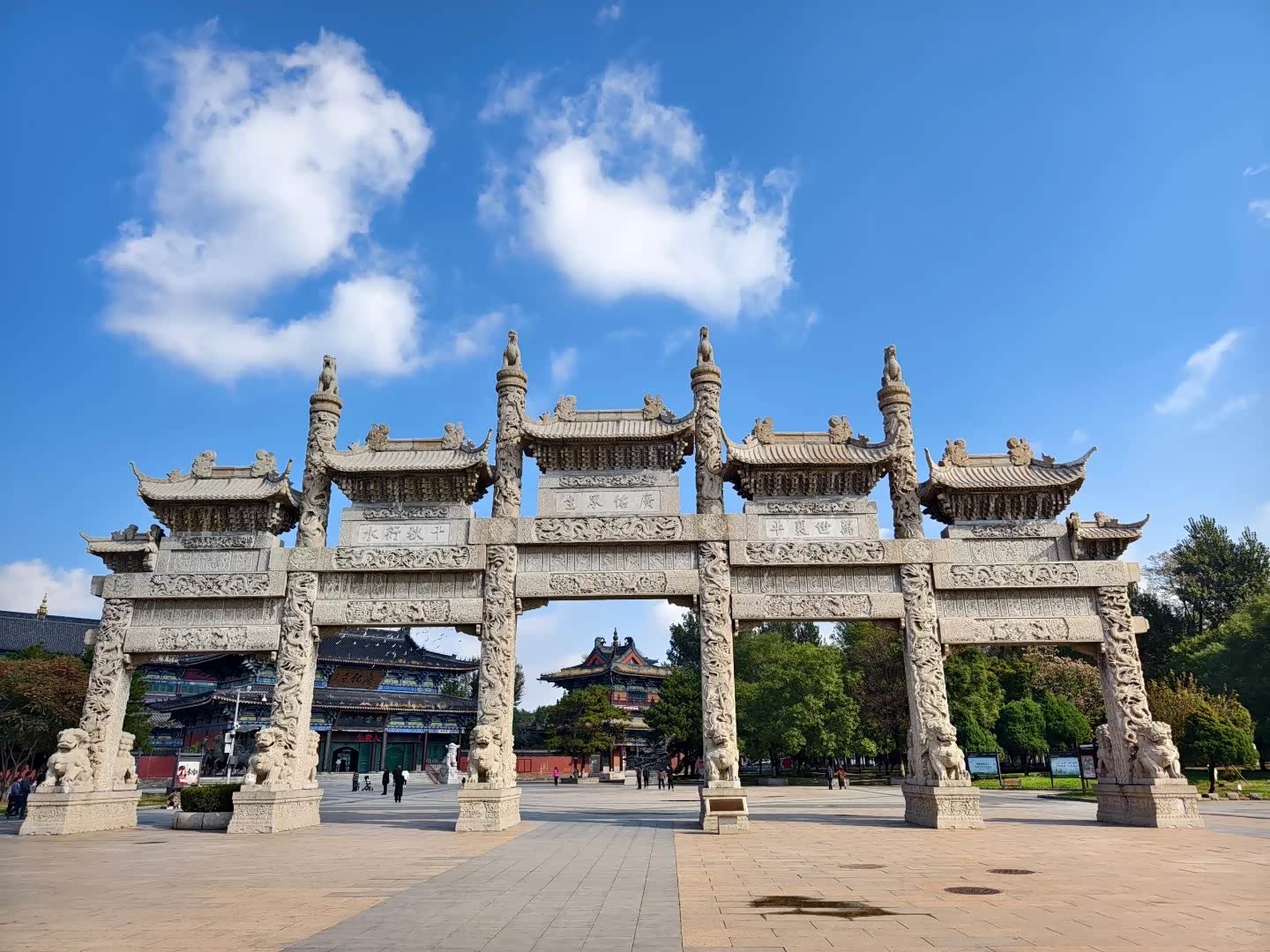 - 世界上最大的青石牌坊,山门前五门六柱的青石牌坊,长34米,高16.9米,由95块巨石雕刻而成。中门上书写着广佑众生,两侧分别刻有万世襄平和千秋衍水。
