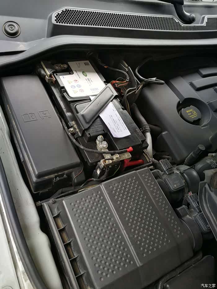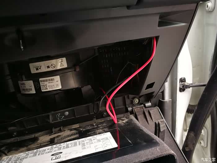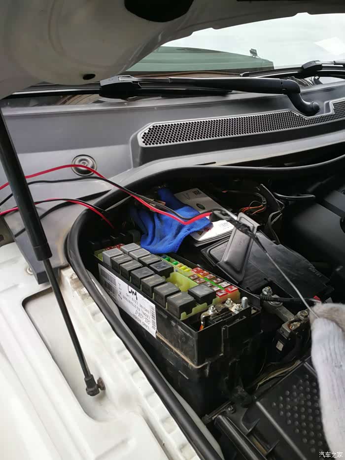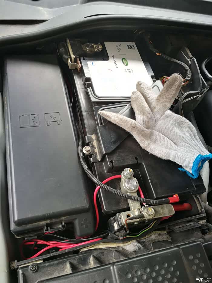 这就是电瓶,在车的右侧,把电瓶盖拿掉就可以看到了,准备工具把电瓶负极拆掉,目的是要在杂物箱里面穿电源线过来,连接电瓶线
