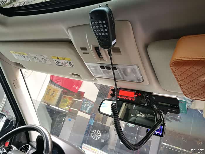 面板摆放在后视镜上面,并且使用3M双面胶粘住,方便调台和开关使用,手柄(手咪)不使用的时候可以拆卸下来放在杂物箱里,毕竟不使用的时候挂在外面不是很好看咯!哈哈