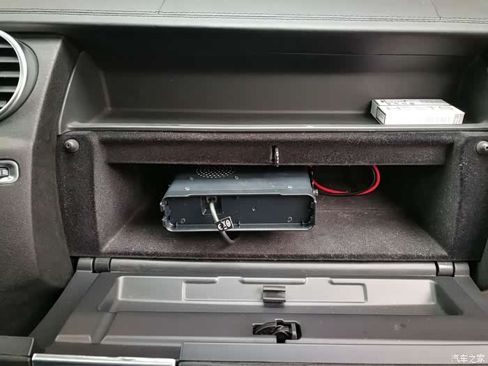 主机摆在杂物箱上层位置,隐藏了起来既看不也不碍地方,天线一端连接在主机上面,天线由这里往外走