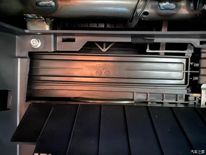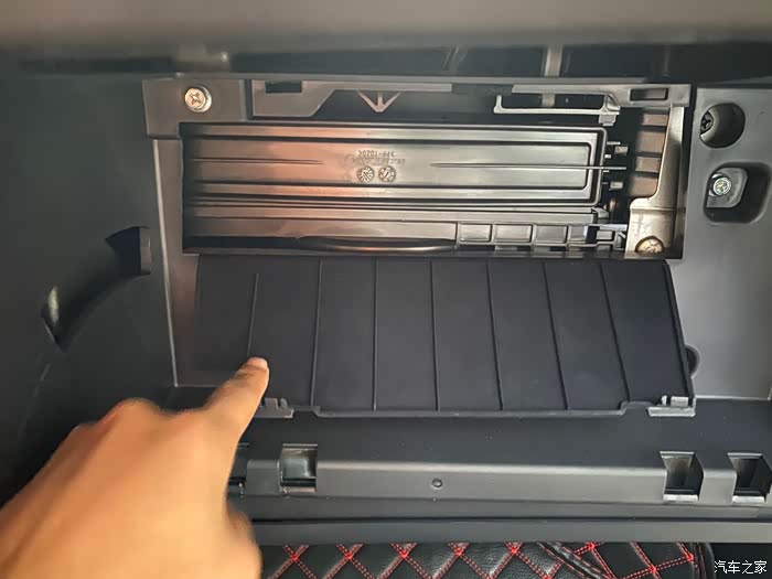 拿开储物盒后面的隔板就可以看到空调滤芯的盖板了