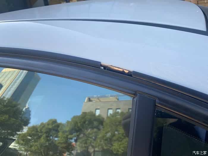 2、车窗上方的外部装饰条掉了一个拼接部分,比较难看,但是这个东西太难找了,4S店要订货,而且要整个维修。配件商地方也找不到相同的配件,我咸鱼上也寻了很久的拆车件也没找到。而且左右两边都掉了这个零件。