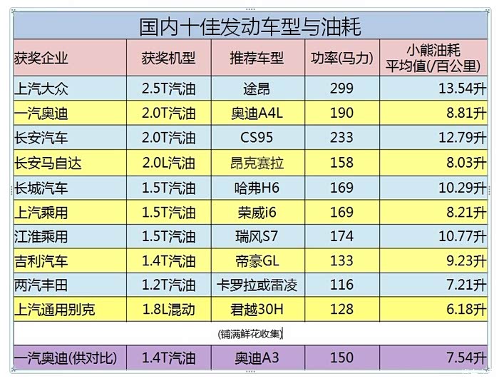 最后给出,目前国内十佳发动机的真实油耗水平,注重排放、注重油耗的朋友可以了解一下: