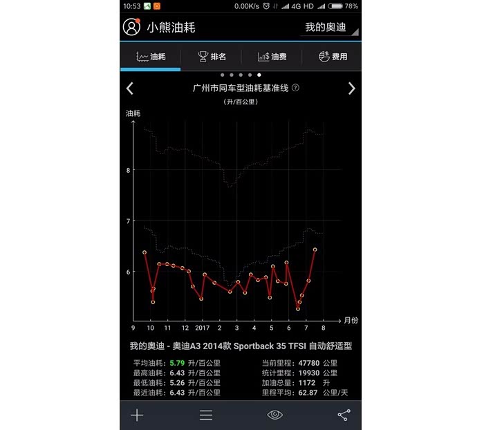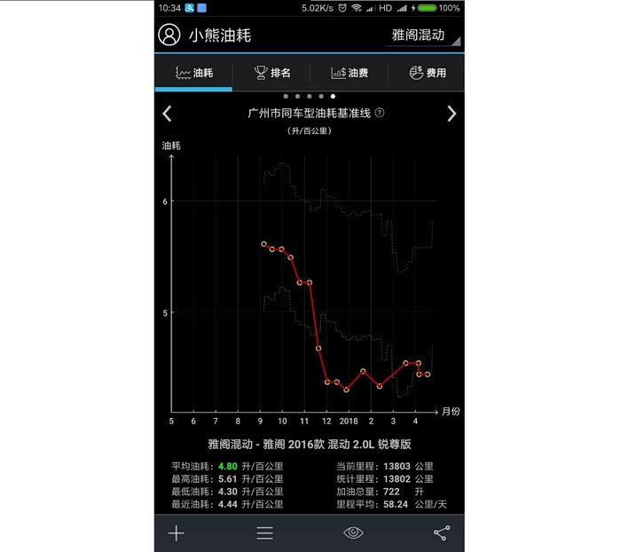从提车到现在(18年5月1日),小熊油耗记录的,这个比较准,4.80升/百公里。期间有几回没有加满,所以出现两个水平段,
