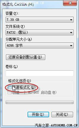 2. 选中【格式化】后,会弹出如下格式化对话框,选中快速格式化,点击【开始】按钮即可进行格式化TF卡,如图