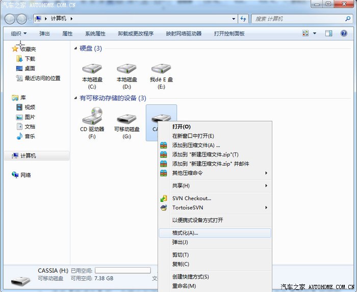 1. 从导航车机取下导航TF卡,通过读卡器等设备连接电脑,打开【我的电脑】,单击鼠标左键选中导航TF卡盘符,然后点击鼠标右键,弹出如下对话框并选中【格式化】选项,如图