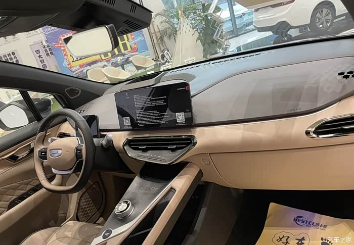 几何C的驾驶舱因为用了很多金属材质,所以整体看起来光泽感比较强。方向盘是全黑皮质的,握上去手感不错,而且贴合手掌处有凹陷设计,长时间握久了也不会觉得累。车标是磨砂和金属两个材质拼接的,看起来不会呆呆的,蛮有质感。