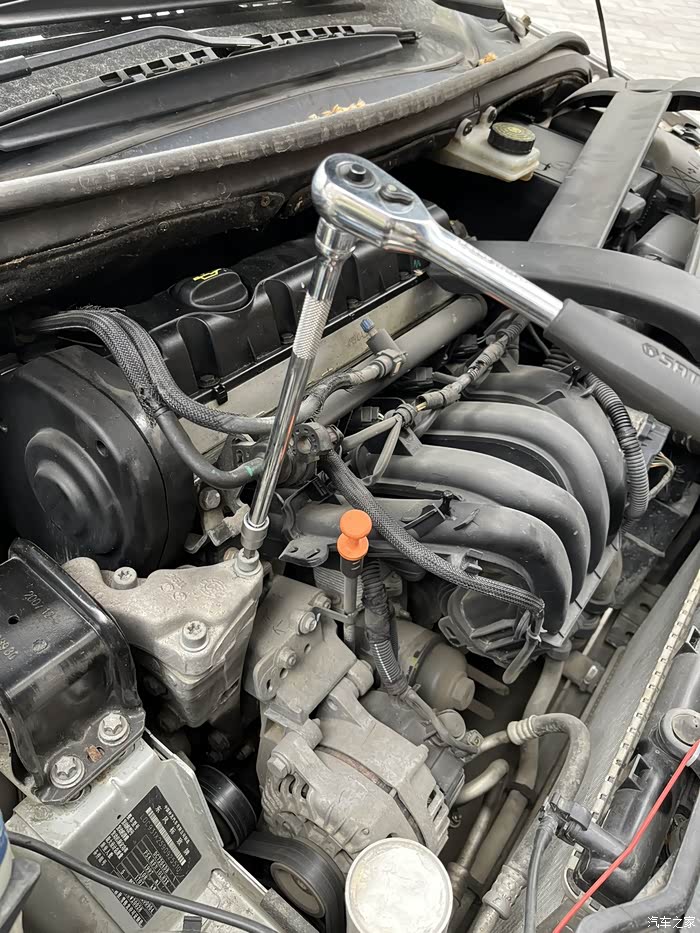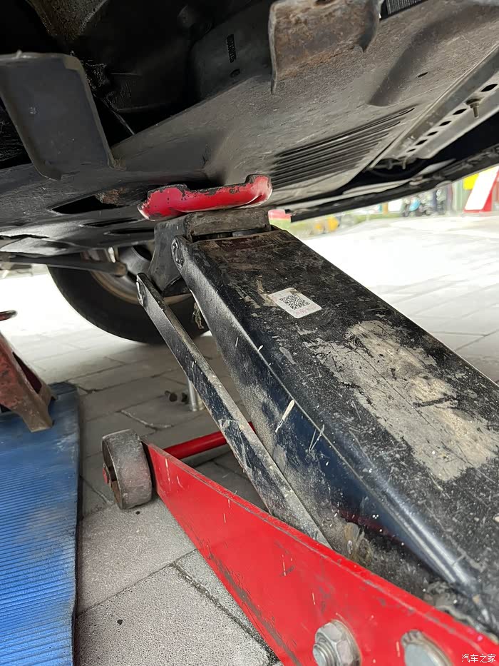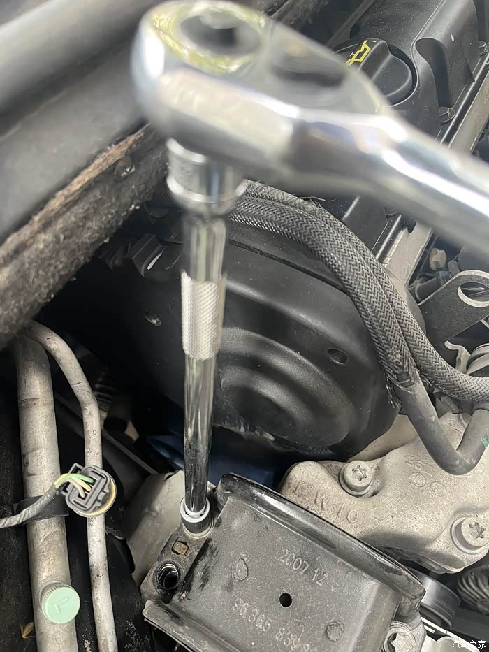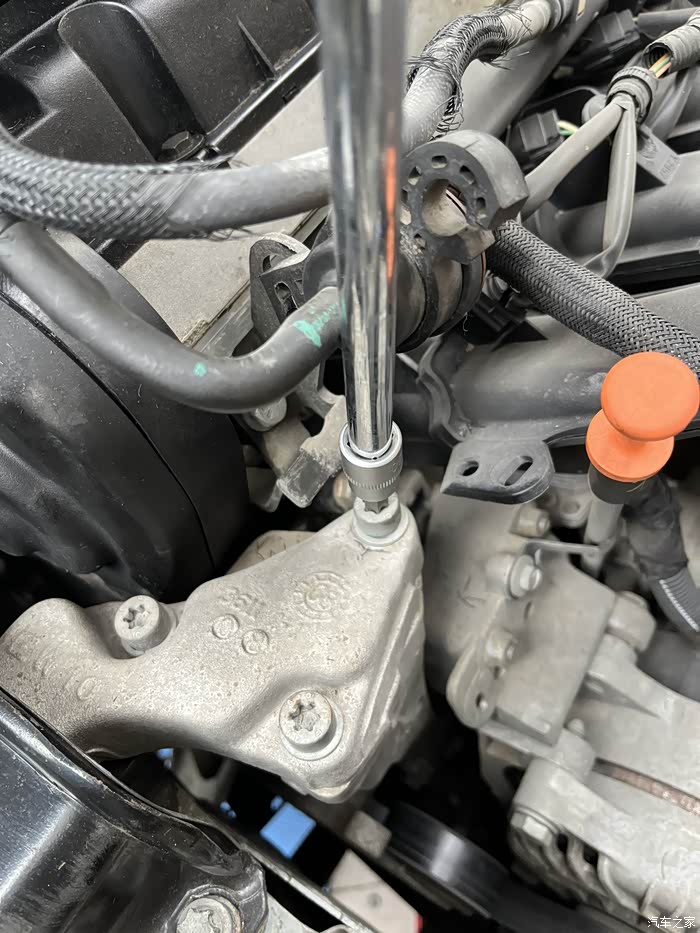 更换时,发动机下面垫块木头,然后用千斤顶顶至合适的位置,就可以拆卸右支架固定螺丝了。卸固定螺丝需要T50和E14。