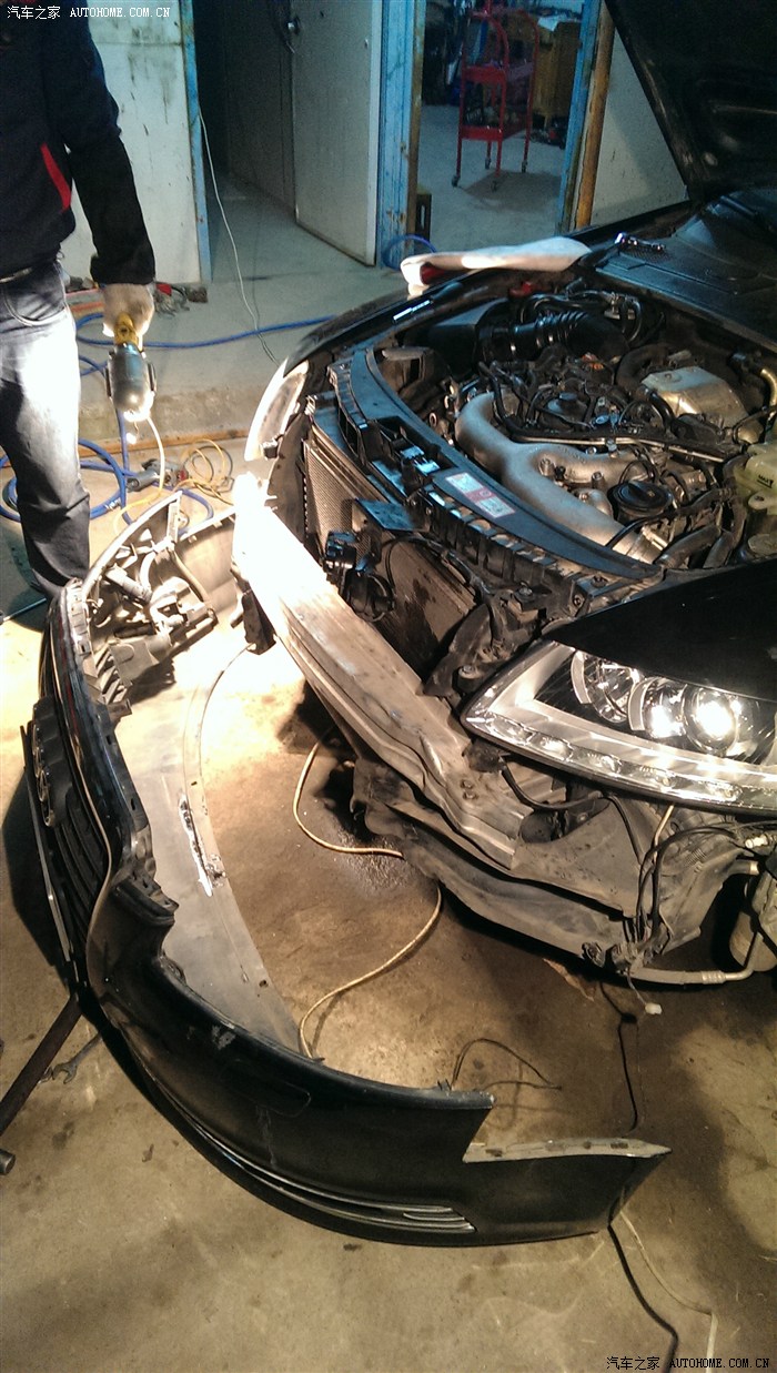 不得不佩服奥迪的防撞梁那个厚啊 还有保险杠 处理过交通事故的朋友应该能看出来驾驶室这边有明显的撞击痕迹 (那次是雨天路滑 老爸没刹住装上墙了 防撞梁都撞变形了 保险杠就掉了点漆)