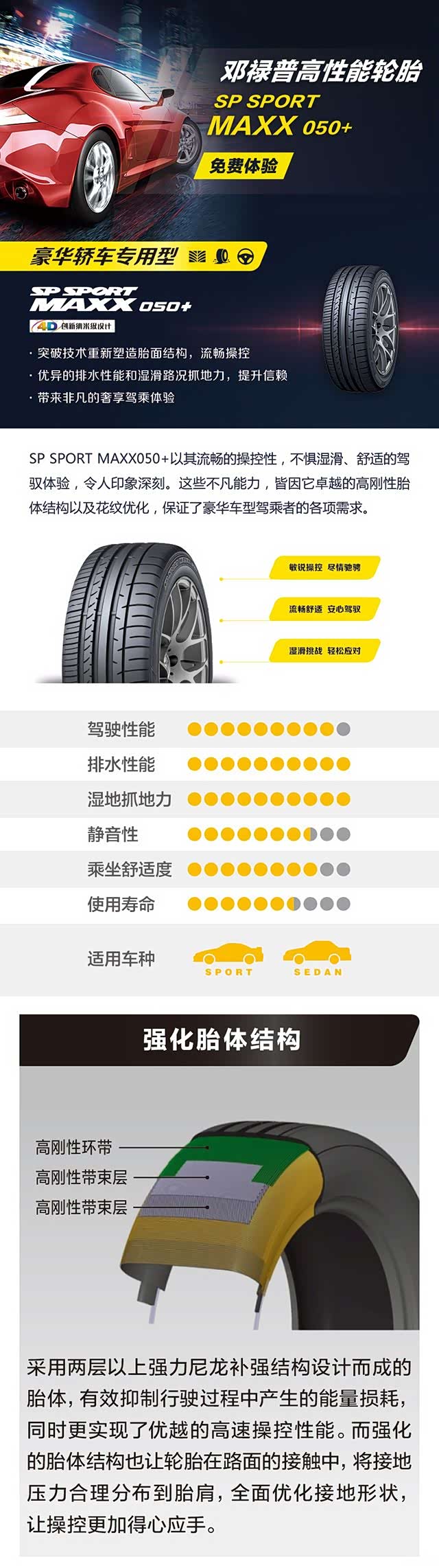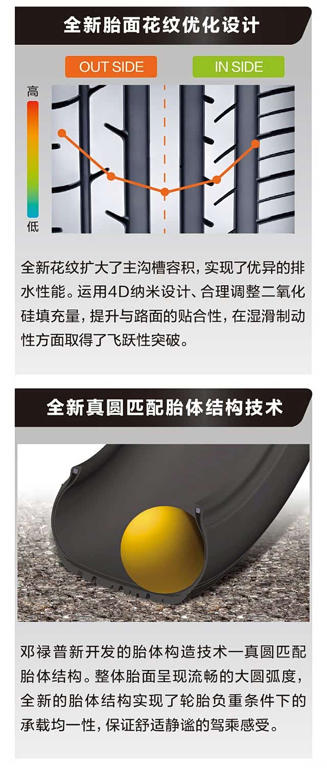 最新的邓禄普采用突破性技术重新塑造胎面结构,让优异的排水性能和湿滑路况抓地力,带来非凡舒适的奢享驾乘体验。具体我就不啰嗦说了 上面的配图详细的解读了邓禄普的优越性能。