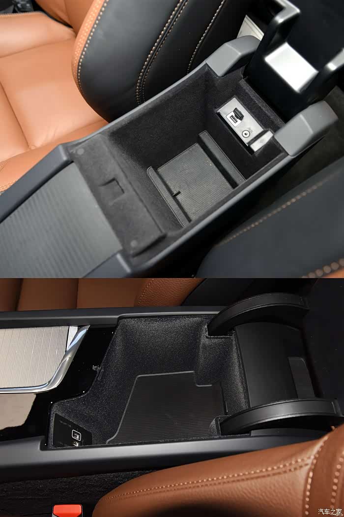 打开扶手箱,内部储物空间提升了很多,USB也有老款的一个增加至两个,老款的AUX插口被取消,实在是利用率太低,还是USB来的更实在些。
