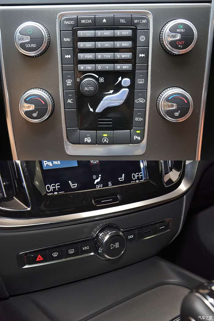 老款车型上的按键罗列,几乎不怎么用,在新V60上,物理按键大部分都被取代,集合到了触控屏幕中,但也保留了多媒体基础按键及除霜雾按键。双闪按键位置略显不醒目。