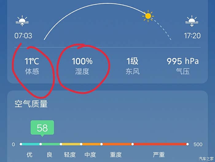 比如上图所示的这种情况,室外温度在11度,当时还下着小雨,气象台已经发布了大雾黄色警告,空气中的湿度达到了100%,如果车友们碰上这种情况,且连日降雨,车辆室外停放,又是凌晨需要冷车出发。别犹豫,提前使用手机APP打开远程空调吧,费那一点电量会给你带来更安全的驾驶体验,这一切都是值得的