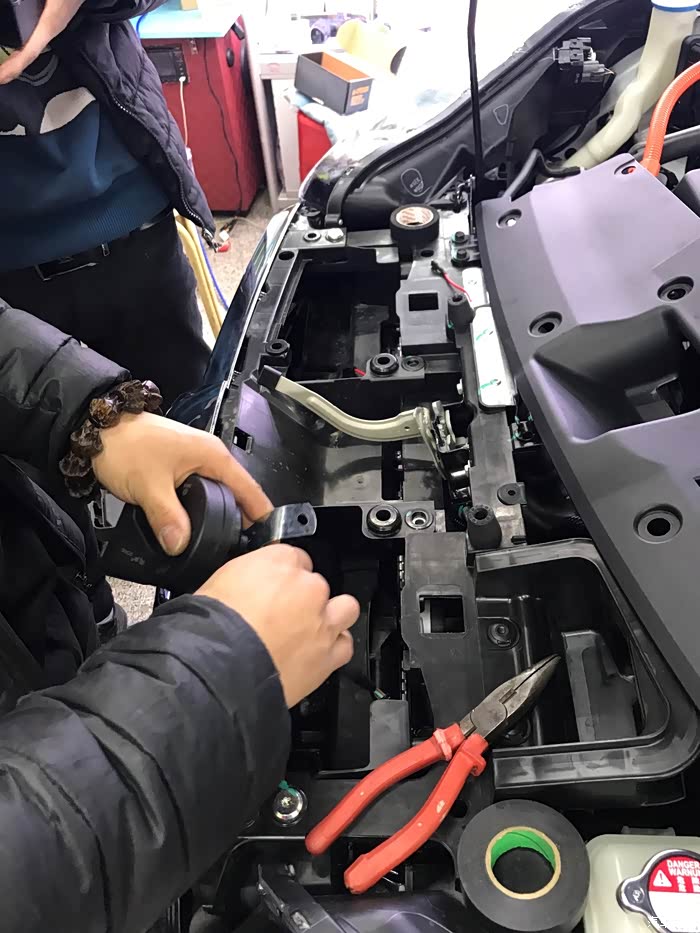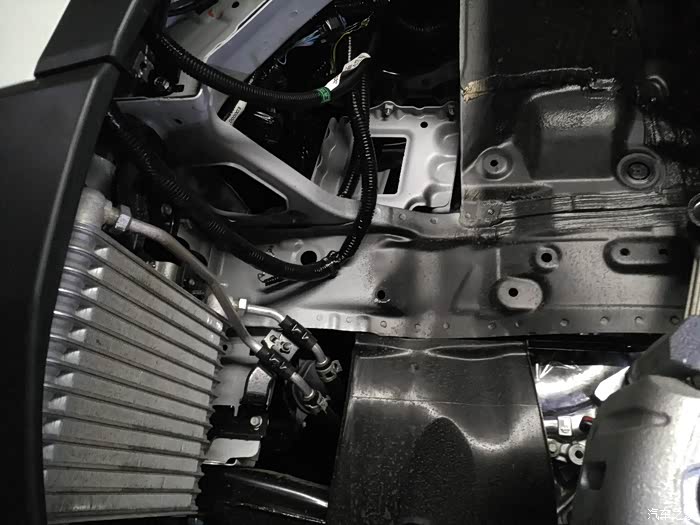 左前保险杠里面有电动机的散热器,这个位置千万别碰,估计会很贵。
