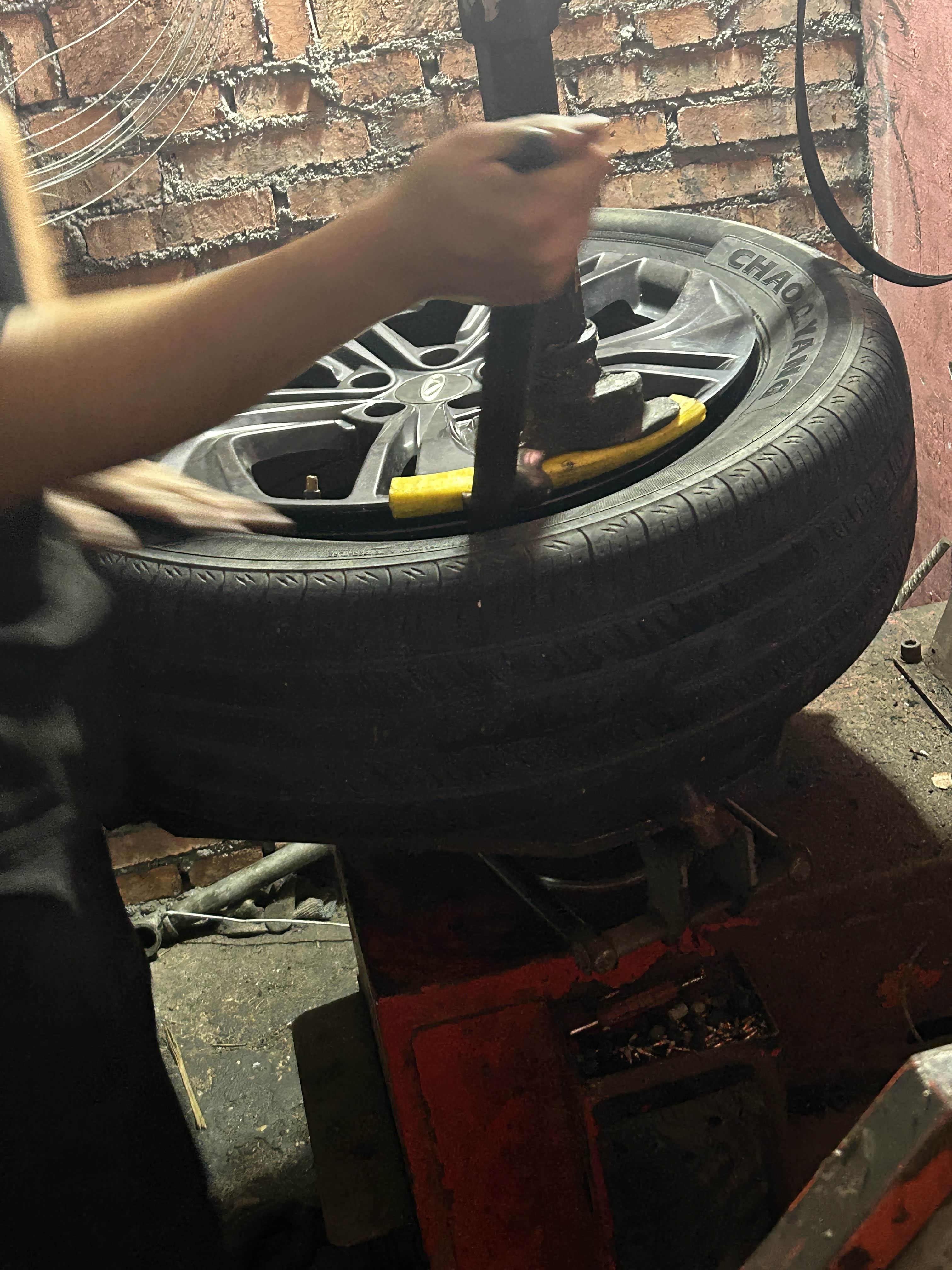 见我答应了下来,师傅先用千斤顶把前轮胎拆了下来,又把钢圈拆下来,最后才把钉子拔下来,是一根将近2公分的大头钉,维修好轮胎又重新装上,再给车做了个平衡校正,维修才算完,服务还是可以的,最后还在他店里洗了个车,又花了15元!