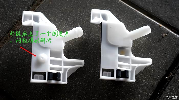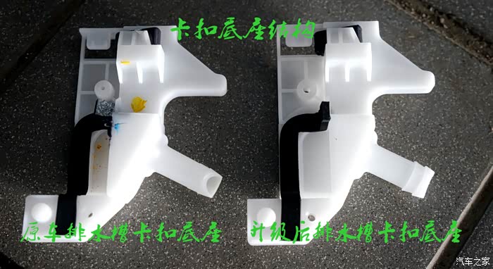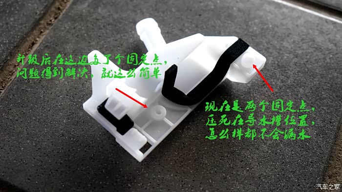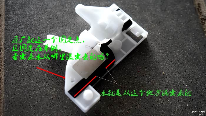 所有出现漏水(渗透车顶或B柱)都是因为这个卡座引起的,④张图都做了解说,应该通俗易懂, 车没问题,卡座也没问题,问题就出在出厂是单边固定,雨水一大,水就会从固定点的另外一侧渗出,升级后的卡座,另外一边多了一个固定点,问题就解决了,就这么简单。