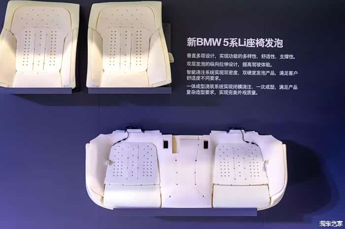 针对突发情况起到关键作用的侧气囊,5系座椅用铆接工艺代替了常用的螺接技术,这也是目前最先进的气囊装配技术,使产品装配更加稳定、可靠。区别于标准轴距版5系,BMW 5系Li的后排座椅采用7系同等的骨架平台。为了加强动态舒适体验,宝马座椅还采用了“全表面单向拉伸泡棉粘贴”技术,使用单层泡棉表面合成一层基布,实现纵向单向拉伸功能。车辆在激烈驾驶时可以实现更稳定的坐姿,业内独有。一次成型的双密度、双硬度泡棉在满足舒适性的同时又起到很好的动态支撑性。