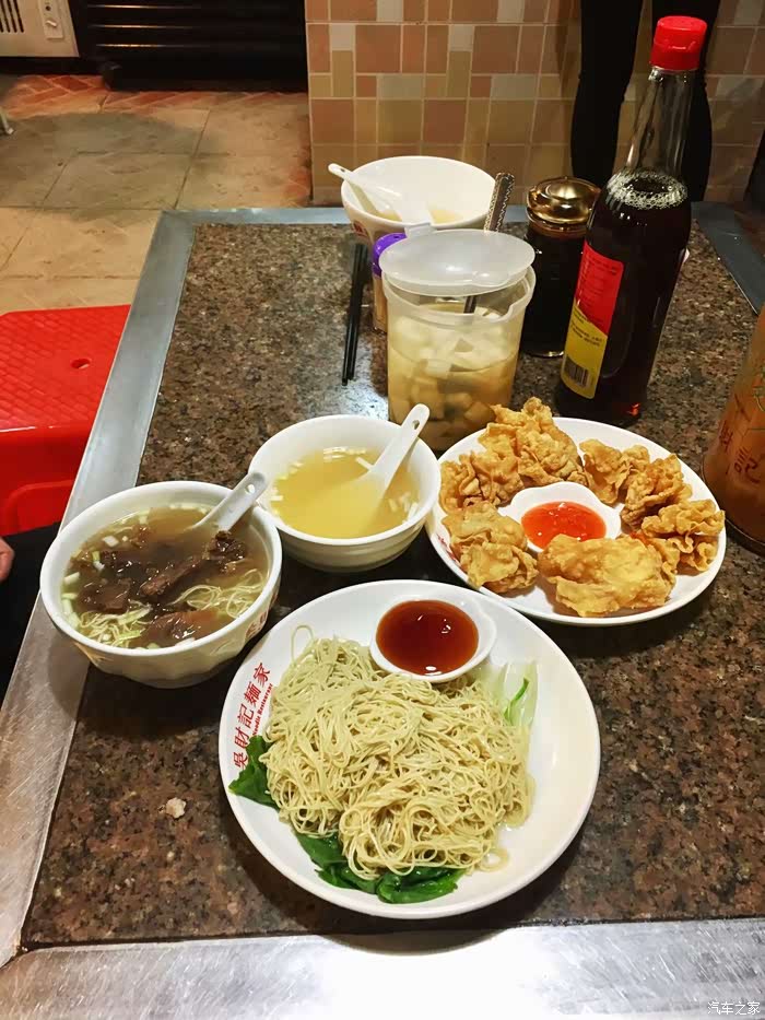 回酒店把吃的扔冰箱囤着,又在大众点评上找到一家口碑不错的吴财记面家,离酒店只有十分钟步程。跟着导航走进小巷子,才发现他家生意的火爆,点单都要排队,价格比宝华面店便宜了一倍还不止,我就点了个蚝油捞面,朋友依然要了牛腩面,又加了份炸云吞,感觉这吃法挺新奇的。