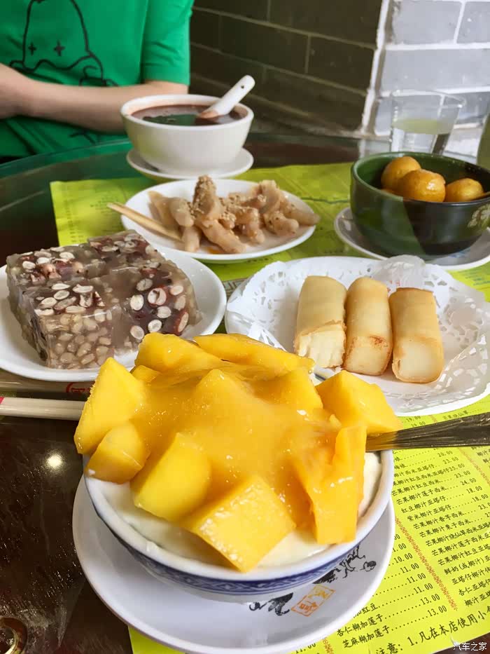 抱着试一试的态度,去了清晖园对面的民信老铺,店内已经爆满了,走路都得侧着身子走;我们点了红豆沙、双皮奶、炸牛奶、凤爪、鱼蛋和一个杂粮糕,不过每一样都是迷你装,只能当作个下午茶解解馋。除了红豆沙觉得太甜之外,其他的都好吃到飞天啊!觉得第一次吃到这么无敌好吃的双皮奶,重要的是居然没那么甜,配上微酸的芒果就刚刚合适,超棒。